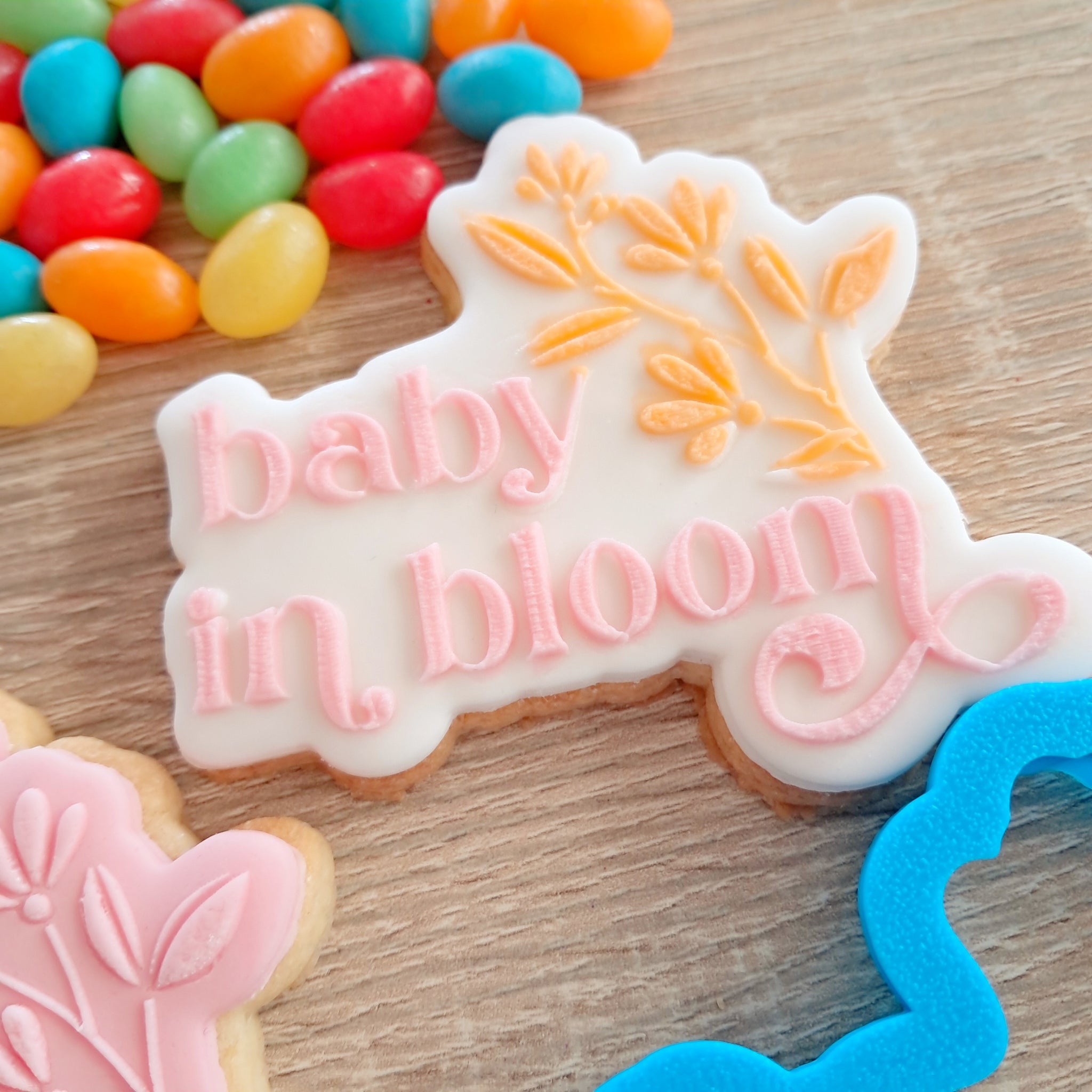 This gorgeous Baby in Bloom stamp, featuring a cute stem of flowers, is perfect for baby shower cookies and more!